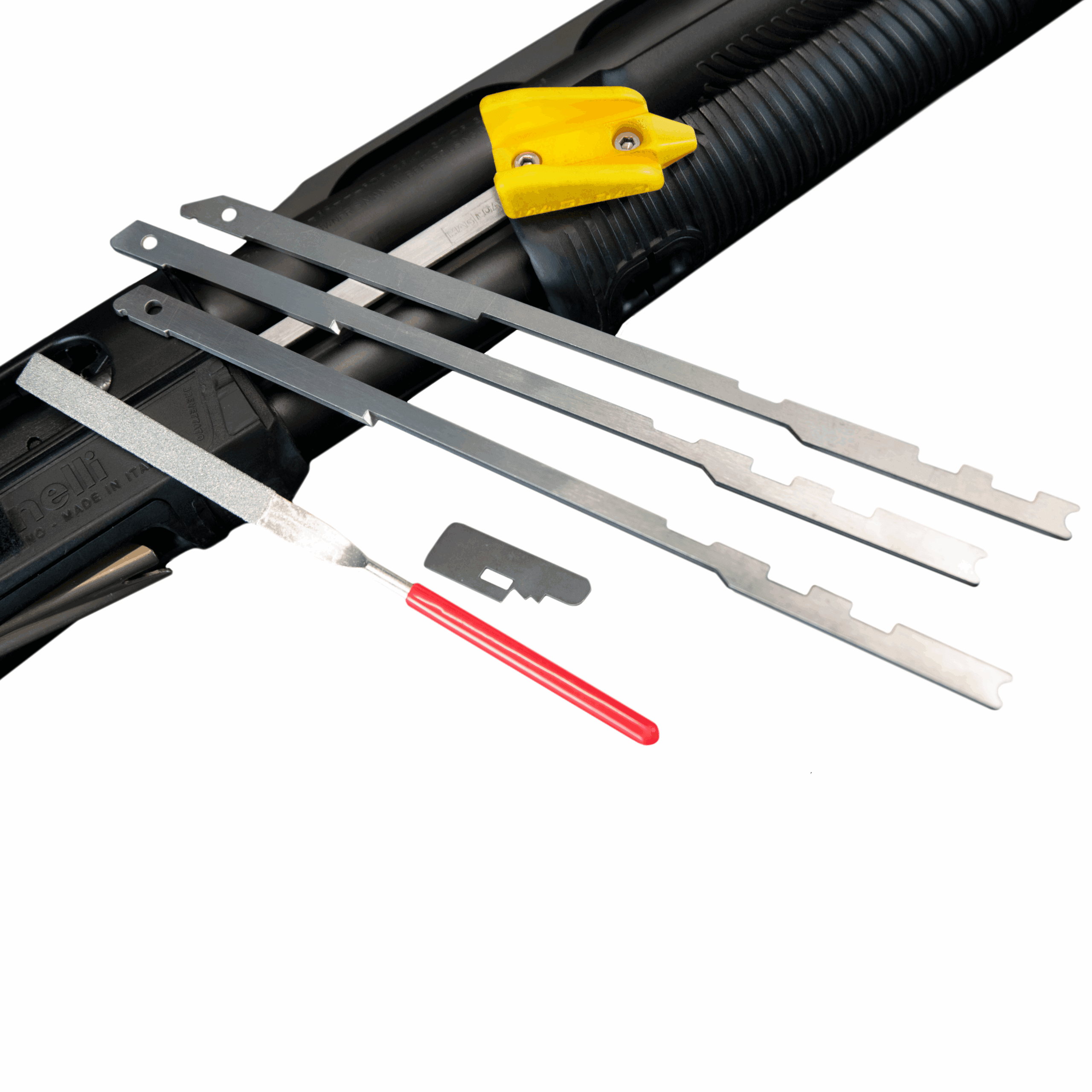 The bars have a polished finish in order to be as slick as possible, with no rough surfaces that can wear down the action or receiver. The kit will shorten the 3.5″ action of the Benelli Supernova or Benelli Nova to feed 2.75″ shells. (64mm unfired length). The pump handle is also moved backward around 20mm which will result in a more comfortable grip and make the gun MUCH more ergonomic for most shooters.